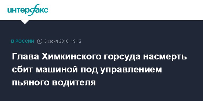 Москва. 6 июня. INTERFAX.RU - Пьяный водитель сбил насмерть главу Химкинского городского суда. "В пятницу поздно вечером был насмерть сбит пьяным водителем председатель Химкинского городского суда Козлов", - сообщили "Интерфаксу" в пресс-службе Московского областного суда в воскресенье. От дальнейших комментариев представитель суда отказался, сославшись на отсутствие дополнительной информации на данный момент.