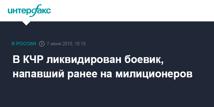 Москва. 7 июня. INTERFAX.RU - В горно-лесистой местности Бийчесын в Карачаево-Черкесии ликвидирован участник НВФ Рашид Биджиев, разыскиваемый за нападение на милиционеров и хранение оружия, сообщил представитель пресс-службы МВД по КЧР Казим Байбанов.