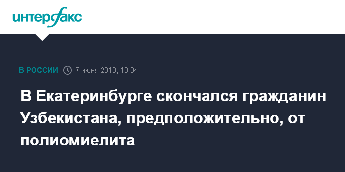 Москва. 7 июня. INTERFAX.RU - Медики Екатеринбурга направили в Москву для проверки на полиомиелит лабораторные данные гражданина Узбекистана, скончавшегося в городе в конце минувшей недели, сообщила на брифинге в понедельник замминистра здравоохранения Свердловской области Диляра Медведская. "Погибший пациент с подозрением на полиомиелит обследован, материалы направлены в Москву, по окончании будет поставлен окончательный диагноз", - отметила Медведская.