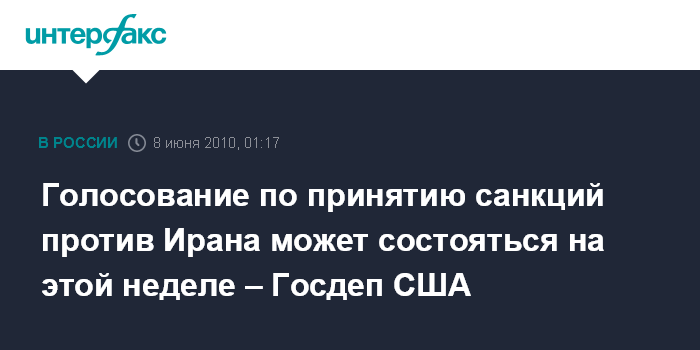 Вашингтон. 7 июня. ИНТЕРФАКС - США ожидают, что голосование по резолюции ООН, касающейся санкций против Ирана, состоится уже на этой неделе, сообщил в понедельник на брифинге в Госдепе США помощник госсекретаря Филип Кроули.