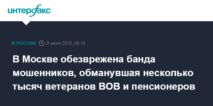 Москва. 8 июня. INTERFAX.RU - Оперативники УБЭП ГУВД столицы пресекли деятельность банды мошенников, обманувшей несколько тысяч ветеранов Великой Отечественной войны и обычных пенсионеров на общую сумму в несколько десятков миллионов рублей, сообщил "Интерфаксу" начальник пресс-группы УБЭП ГУВД Москвы Филипп Золотницкий.