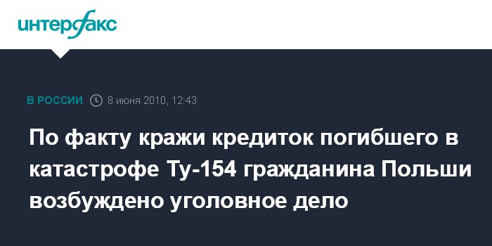 По факту кражи кредиток погибшего в катастрофе Ту-154 гражданина Польши возбуждено уголовное дело