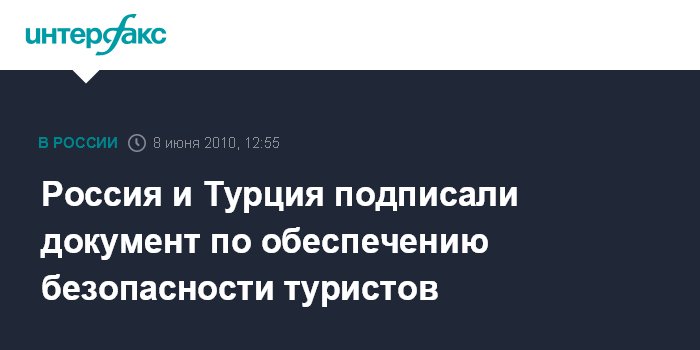 Москва. 8 июня. INTERFAX.RU - Россия и Турция подписали совместное заявление по обеспечению безопасности пребывания туристов из числа своих граждан на территориях двух стран. С российской стороны совместное заявление подписал руководитель Федерального агентства по туризму Анатолий Ярочкин, с турецкой - заместитель министра культуры и туризма Исмет Ялмаз. Документ был подписан в присутствии главы правительства РФ Владимира Путина и премьер-министра Турции Реджепа Тайипа Эрдогана.