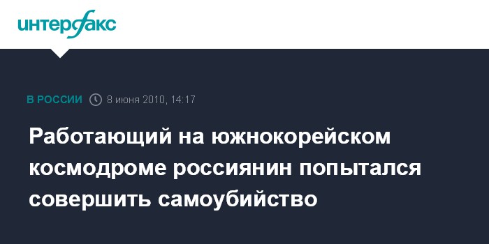 Москва. 8 июня. INTERFAX.RU – Гражданин России, работающий на южнокорейском космодроме, попытался совершить самоубийство, пишет во вторник газета "Чосон ильбо".