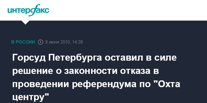 Москва. 9 июня. INTERFAX.RU – Санкт-Петербургский городской суд отклонил кассационную жалобу инициаторов референдума по "Охта центру" на решение Октябрьского суда, признавшего справедливым отказ Законодательного собрания города в проведении плебисцита.