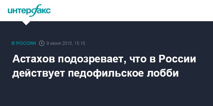 Москва. 9 июня. INTERFAX.RU - Уполномоченный по правам ребенка при президенте РФ Павел Астахов подозревает, что в российском парламенте существуют лоббистские группы, противодействующие принятию законопроектов, направленных на борьбу с педофилией. "Что касается прохождения законов в парламенте (по ужесточению наказания в отношении педофилов - ИФ), то, несмотря на то, что все прекрасно понимают, что нужно выставить заслон и пресечь действия педофилов, однако когда начинается обсуждение в профильных комитетах Госдумы, вдруг находятся люди, которые против этого, - заявил Астахов на пресс-конференции в центральном офисе "Интерфакса" в среду. - И я задаю себе вопрос: а не существует ли у нас педофильское лобби, которое просто это финансирует и противодействует принятию законов (по борьбе с педофилией - ИФ)? Думаю, я не далек от истины".