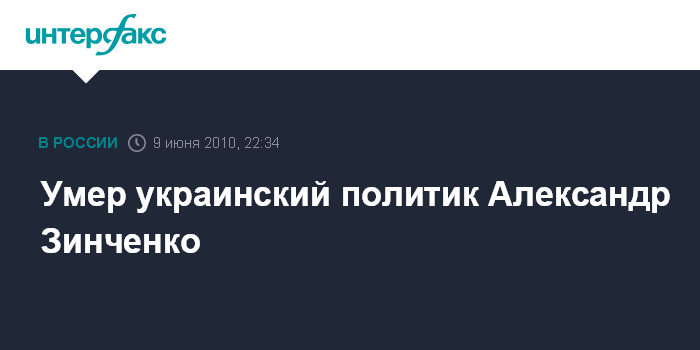 Киев. 9 июня. ИНТЕРФАКС-УКРАИНА - Известный украинский политик Александр Зинченко скончался в среду на 54-м году жизни в Киеве. Эту информацию агентству "Интерфакс-Украина" подтвердила пресс-секретарь А.Зинченко Анна Калина.