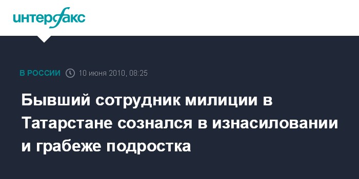 Москва. 10 июня. INTERFAX.RU - Следственные органы Татарстана в среду возбудили уголовное дело в отношении бывшего милиционера патрульной службы милиции Казанского линейного отдела внутренних дел на транспорте (КЛОВДТ), подозреваемого в изнасиловании 14-летнего подростка и краже его сотового телефона.