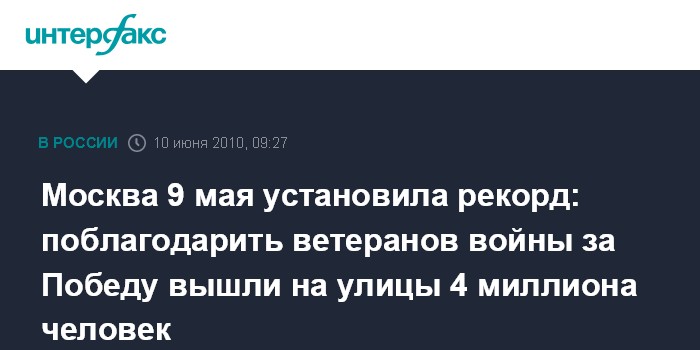 Москва. 10 июня. INTERFAX.RU - Мэр Москвы Юрий Лужков заявил, что в столице в День 65-летия Победы 4 миллиона москвичей одновременно вышли на улицы и площади, чтобы выразить свою благодарность ветеранам. по данным столичного градоначальника это является рекордом.