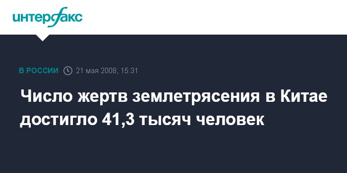 Москва. 21 мая. INTERFAX.RU - Официальное число погибших в результате разрушительного землетрясения в Китае увеличилось в среду до 41353 человек.