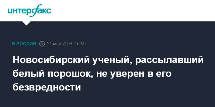 Москва. 21 мая. INTERFAX.RU - Новосибирский ученый из Института теоретической и прикладной механики (ИТПМ) Сибирского отделения РАН профессор Сергей Бардаханов, приславший по почте замдиректора Института кристаллографии им. Шубникова РАН белый наноразмерный порошок-оксид сегодня сожалеет о своей уверенности в его полной безвредности.