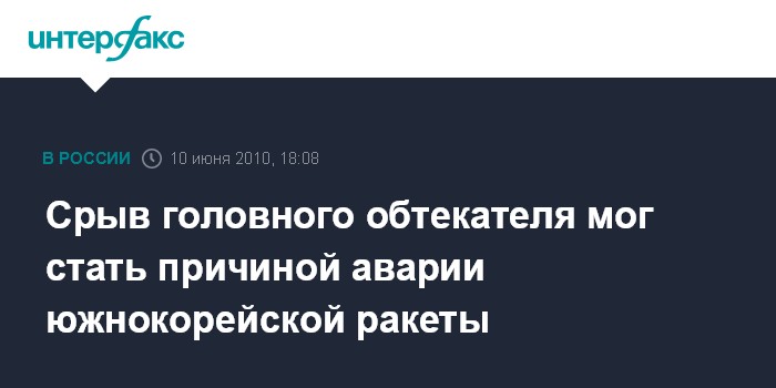 Москва. 10 июня. INTERFAX.RU - От южнокорейской ракеты-носителя "Наро-1" через две минуты после старта отделился крупный объект, который может быть головным обтекателем, сообщил "Интерфаксу" в четверг источник в российской ракетно-космической отрасли.