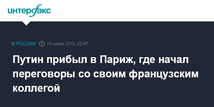 Париж. 10 июня. ИНТЕРФАКС - Премьер-министр РФ Владимир Путин прибыл с двухдневным рабочим визитом в Париж, где примет участие в открытии Российской национальной выставки.