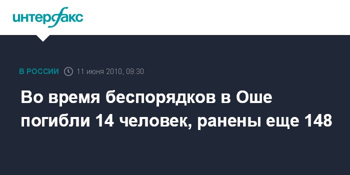 Москва. 11 июня. INTERFAX.RU - В результате беспорядков в городе Ош на юге Киргизии 14 человек погибли и 148 ранены, сообщили "Интерфаксу" в пятницу в пресс-службе Минздрава республики. По данным пресс-службы, в настоящий момент госпитализировано 94 человека, большая часть из них - с огнестрельными ранениями.
