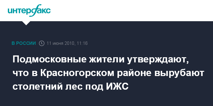 Москва. 11 июня. INTERFAX.RU - Столетний лес в Красногорском районе вырубается под индивидуальное жилищное строительство, сообщила в пятницу "Интерфаксу" жительница местного села Желябино. "Участок в 22 га, принадлежащий совхозу, переведен решением правительства Подмосковья под индивидуальное жилищное строительство. Но на этом участке шикарный лес, ценные хвойные породы, столетние сосны, и это никого не озаботило, прокуратура говорит, бумаги в порядке, - сказала собеседница агентства. - С 2007 года мы подаем обращения, чтобы лес в деревне Желябино Красногорского района не трогали, однако от чиновников одни отписки, а устно говорят, что ничего у нас не выйдет, за все заплачено". "Лес, который высаживали еще ветераны войны и их дети, вырубается уже с февраля этого года. Раньше только прорубали просеки, а теперь идет вырубка целых участков", - отметила местная жительница.