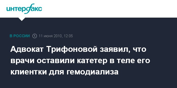 Москва. 11 июня. INTERFAX.RU - Врачи специально поставили катетер Вере Трифоновой, скончавшейся в конце апреля в столичном СИЗО-1, а причина ее смерти - в отсутствии квалифицированной медпомощи, считает адвокат по делу Трифоновой Владимир Жеребенков. "Это - не забытый катетер. Этот катетер 23 апреля врачи МОНИКИ (Московский областной научно-исследовательский клинический институт им. М.Ф.Владимирского - ИФ) специально оставили для того, чтобы сделать ей гемодиализ", - сказал Жеребенков "Интерфаксу" в пятницу. Так он прокомментировал заявление СКП об обнаружении в теле В.Трифоновой катетера, возможно, ставшего косвенной причиной ее гибели.