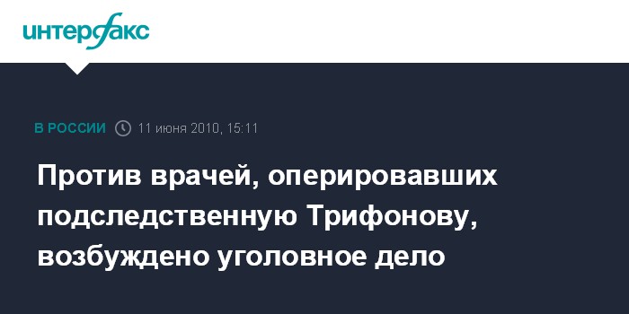 Москва. 11 июня. INTERFAX.RU - Возбуждено уголовное дело в отношении медицинских работников, проводивших операцию предпринимателю Вере Трифоновой, которая впоследствии скончалась в СИЗО № 1 ("Матросская тишина"), сообщил "Интерфаксу" глава следственного управления СКП РФ по Москве Анатолий Багмет. По его словам, дело возбуждено по ч. 2 ст. 109 УК РФ "причинение смерти по неосторожности, вследствие ненадлежащего исполнения лицом своих обязанностей".