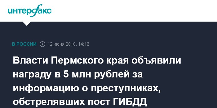 Москва. 12 июня. INTERFAX.RU – Власти Пермского края объявили вознаграждение за информацию о преступниках, обстрелявших минувшей ночью пост ГИБДД, сообщил агентству "Интерфакс-Поволжье" в субботу министр общественной безопасности Пермского края Игорь Орлов.