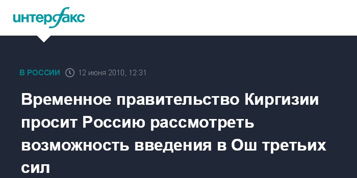 Москва. 12 июня. INTERFAX.RU – Временное правительство Киргизии обращается к руководству России с просьбой рассмотреть возможность введения в зону межнационального конфликта на юге страны третьих сил, заявила в субботу журналистам руководитель временного правительства Киргизии Роза Отунбаева.