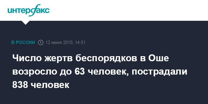 Москва. 12 июня. INTERFAX.RU – В результате беспорядков в городе Ош на юге Киргизии погибли 63 человека, сообщили "Интерфаксу" пресс-службе Минздрава республики.