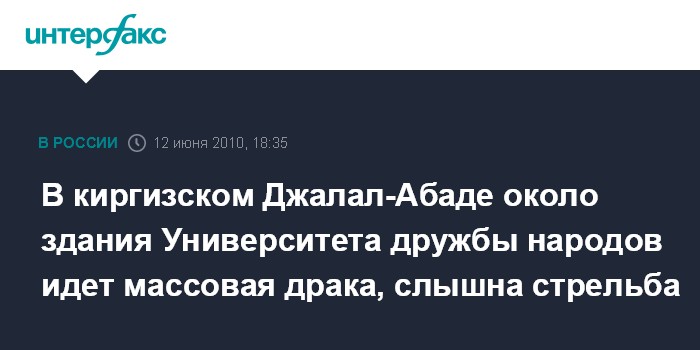 Москва. 12 июня. INTERFAX.RU – Около здания Университета дружбы народов в Джалал-Абаде происходят столкновения, сообщают "Интерфаксу" очевидцы.