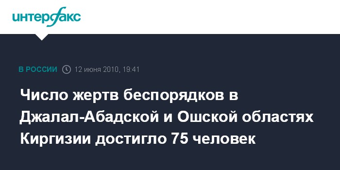 Бишкек. 12 июня. ИНТЕРФАКС - Жертвами столкновений в Ошской и Джалал-Абадской областях на юге Киргизии стали уже 75 человек, сообщили "Интерфаксу" в пресс-службе Минздрава республики.