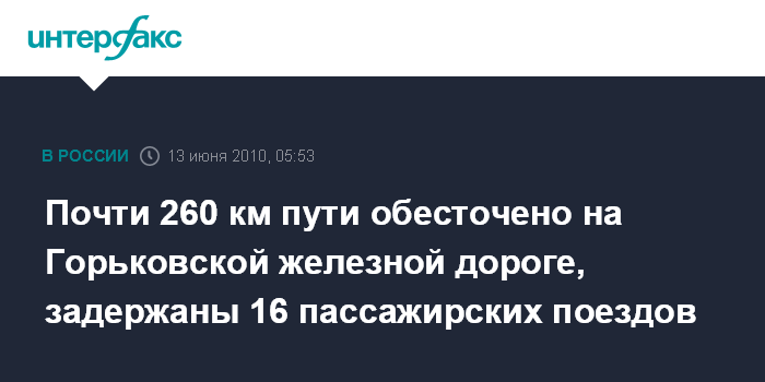 Москва. 13 июня. ИНТЕРФАКС - Отключение электроснабжения стало на участке Нижний Новгород - Киров Горьковской железной дороги причиной задержки 16 пассажирских поездов, сообщает пресс-служба ОАО "РЖД".