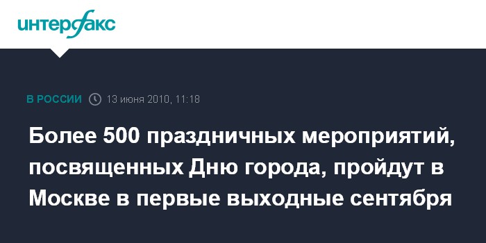 Москва. 13 июня. INTERFAX.RU – Программа основных городских мероприятий, посвященных празднику Дня города 4 и 5 сентября 2010 года, будет рассмотрена на очередном заседании правительства Москвы во вторник, 15 июня.