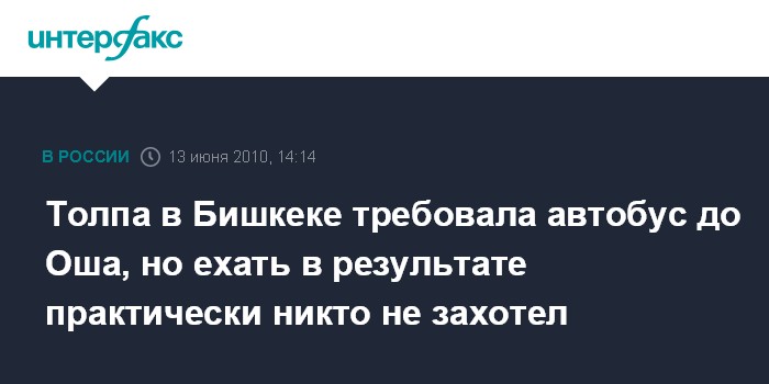 Москва. 13 июня. INTERFAX.RU – В столице Киргизии из сотни молодых людей, требовавших отправки в Ош, в автобус сел лишь десяток человек.