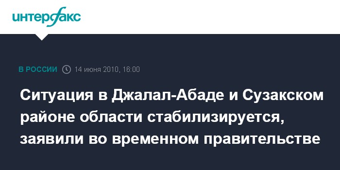 Бишкек. 14 июня. INTERFAX.RU - Зампред временного правительства Киргизии Азимбек Бекназаров заявил, что ситуация в Джалал-Абаде и Сузакском районе области имеет тенденцию к началу стабилизации. "К вечеру понедельника ситуация в Джалал-Абаде и Сузакском районе начала стабилизироваться, противоборствующие стороны договорились о прекращении конфликта", - заявил А.Бекназаров "Интерфаксу".