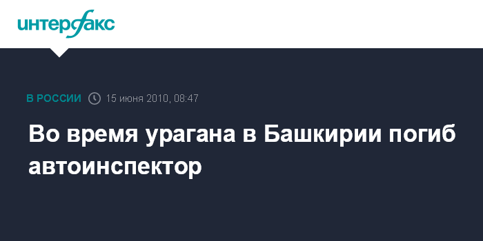 Москва. 15 июня. INTERFAX.RU - В Архангельском районе Башкирии поваленным ураганом деревом убило сотрудника милиции. В пресс-службе МВД по Башкирии агентству "Интерфакс-Поволжье" во вторник сообщили, что несчастный случай произошел 14 июня около 13:00 мск возле деревни Улукулеево. Порыв сильного ветра, 25 м/с, вырвал с корнем огромный тополь, который упал на припаркованный рядом автомобиль "Шкода". Находившийся в салоне иномарки 38-летний инспектор полка ДПС от полученный травм скончался на месте.