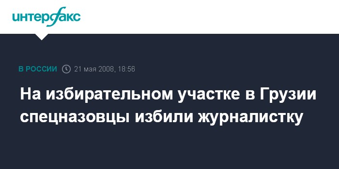 Москва. 21 мая. INTERFAX.RU - Известная грузинская журналистка Элисо Чапидзе в среду была избита спецназовцами на избирательном участке в Сигнахском районе, сообщил журналистам главный редактор газеты "Резонанси" Лаша Тугуши.