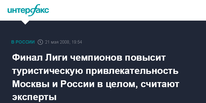 Москва. 21 мая. ИНТЕРФАКС - Проведение финального матча Лиги чемпионов УЕФА поможет продвижению Москвы и России на международном туристическом рынке, считают специалисты отрасли.