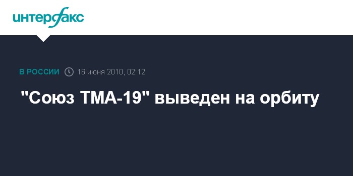 Байконур. 16 июня. ИНТЕРФАКС-АВН - Космический корабль "Союз ТМА-19" с тремя космонавтами на борту выведен на околоземную орбиту ракетой-носителем "Союз-ФГ", стартовавшей с космодрома Байконур (Казахстан), передает корреспондент "Интерфакса-АВН" с космодрома.