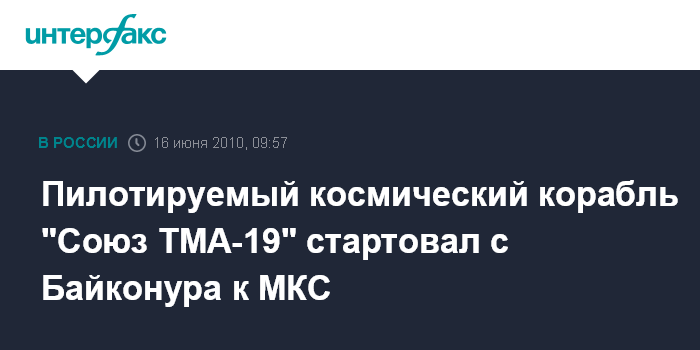 Москва. 16 июня. INTERFAX.RU - Российская ракета-носитель "Союз-ФГ" с космическим кораблем "Союз ТМА-19" запущена минувшей ночью с космодрома Байконур (Казахстан).