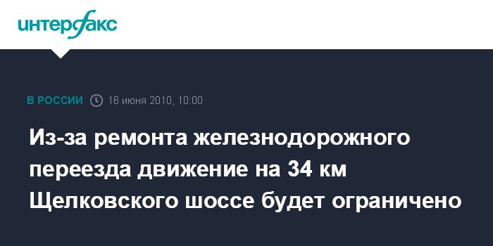 Москва. 16 июня. INTERFAX.RU - Подмосковное ГИБДД предупреждает автолюбителей, что с 10:00 15 июня до 15:00 18 июня и с 10:00 21 июня до 15:00 24 июня будет закрыт железнодорожный переезд на 34 км автомобильной дороги Москва-Щелково.