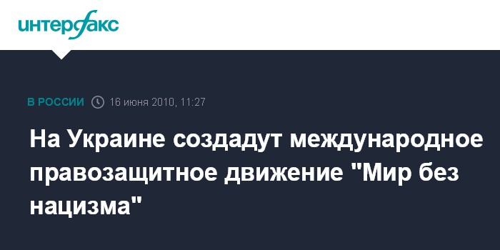 Москва. 16 июня. INTERFAX.RU - Международное правозащитное движение "Мир без нацизма" будет учреждено в Киеве 20-22 июня. Как сообщили "Интерфаксу" в среду в оргкомитете движения, который возглавляет председатель Всемирного конгресса русскоязычного еврейства, российский сенатор Борис Шпигель, правозащитное движение учреждается в год 65-летия Победы, символизируя связь поколений и актуальность борьбы с неофашизмом и неонацизмом в современном мире.