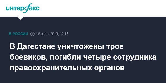 Москва. 16 июня. INTERFAX.RU - Трое боевиков ликвидированы в районе селения Хостек Хасавюртовскго района Дагестана. При этом, по предварительным данным, погибли четыре сотрудника правоохранительных органов.