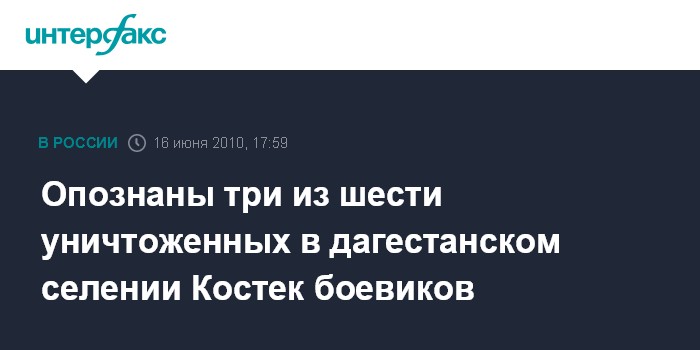 Москва. 16 июня. INTERFAX.RU - По последним данным, шесть боевиков уничтожены в результате специальной операции в дагестанском селении Старый Костек, сообщили "Интерфаксу" в Национальном антитеррористическом комитете. "В ходе спецоперации уничтожено шесть боевиков, трое из которых опознаны. Личности остальных уточняются. Имеются потери и со стороны федеральных сил", - заявили в информационном центре Национального антитеррористического комитета.