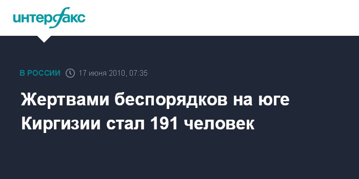 Бишкек. 17 июня. ИНТЕРФАКС - По уточненным данным министерства здравоохранения Киргизии, в ходе массовых беспорядков в Ошской и Джалал-Абадской областях погиб 191 человек, сообщили в четверг "Интерфаксу" в пресс-службе ведомства.