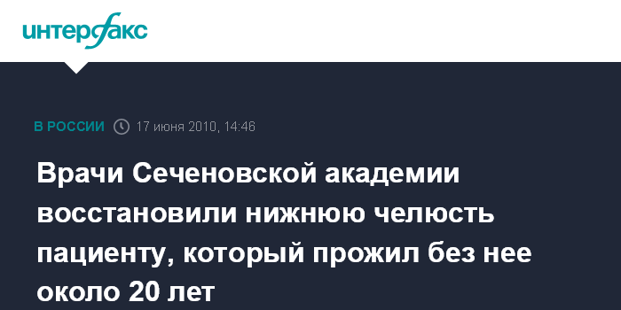 Москва. 17 июня. INTERFAX.RU – Уникальная операция проведена хирургами клиники челюстно-лицевой хирургии Московской медицинской академии имени Сеченова в четверг, сообщили "Интерфаксу" в службе по связям с общественностью академии.