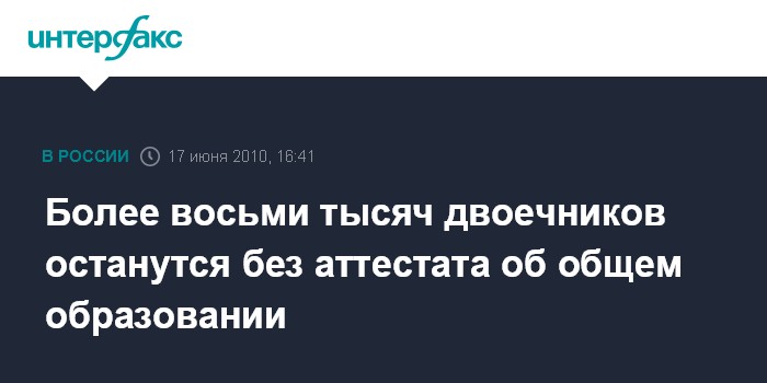 Москва. 17 июня. INTERFAX.RU – Более восьми тысяч выпускников школ этого года не получат аттестат об общем образовании. "На сегодняшний день уже ясно, что 8251 человек из числа выпускников 2010 года не сдали два обязательных экзамена - русский язык и математику. Это означает, что эти ребята уже точно не получат аттестата об общем полном образовании", - сказала руководитель Рособрнадзора Любовь Глебова на брифинге в Москве в четверг.