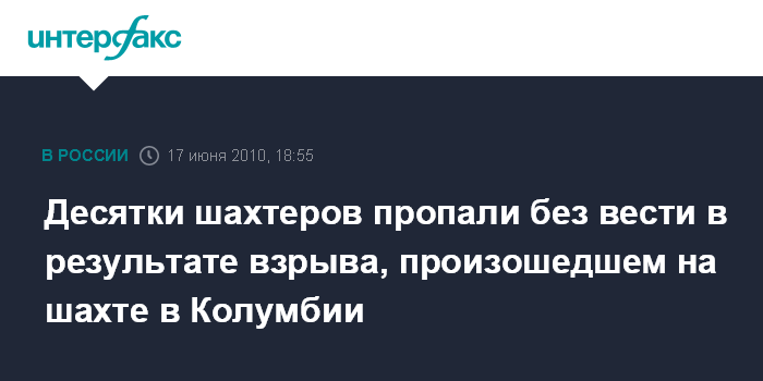 Москва. 17 июня. INTERFAX.RU – Минимум 10 человек погибли и 60 пропали без вести из-за взрыва, произошедшего в четверг на угольной шахте на северо-западе Колумбии, сообщили местные власти.