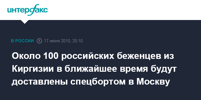 Москва. 17 июня. INTERFAX.RU - столичном аэропорту "Домодедово" ориентировочно около полуночи, как ожидается, приземлится спецборт с первой группой российских граждан - беженцев, пострадавших в результате массовых волнений на юге Киргизии, сообщил "Интерфаксу" источник в российских силовых структурах в четверг.