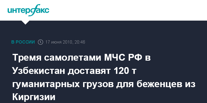 Москва. 17 июня. INTERFAX.RU – МЧС России направляет в Узбекистан самолеты с гуманитарной помощью. "По поручению президента России МЧС направляет в Республику Узбекистан три транспортных самолета Ил-76 с грузом гуманитарной помощи на борту", - сообщила "Интерфаксу" в четверг вечером начальник Управления информации МЧС РФ Ирина Андрианова.