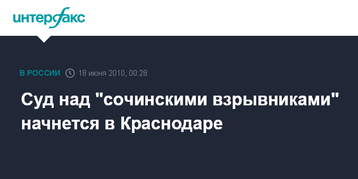 Краснодар. 18 июня. ИНТЕРФАКС-ЮГ - В Краснодарском краевом суде в пятницу, как ожидается, начнется процесс по делу о серии взрывов в Сочи в 2008-2009 годах.