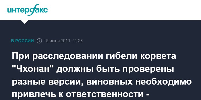 Москва. 18 июня. ИНТЕРФАКС - Президент РФ Дмитрий Медведев заявил, что при расследовании гибели южнокорейского корвета "Чхонан" должно быть отработаны различные версии, а виновные, даже если это - государство, понести наказание.