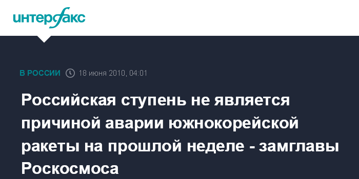 Королев (Московская область). 18 июня. ИНТЕРФАКС-АВН - Российская первая ступень южнокорейской ракеты-носителя KSLV, скорее всего, не причастна к аварии, произошедшей на прошлой неделе, заявил журналистам в Центре управления полетами в пятницу замруководителя Роскосмоса Виталий Давыдов.