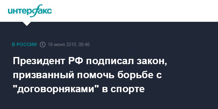 Москва. 18 июня. INTERFAX.RU - Президент России Дмитрий Медведев подписал закон "О внесении изменения в статью 184 Уголовного кодекса Российской Федерации", сообщила в пятницу пресс-служба главы государства. Федеральный закон был принят Госдумой 4 июня и одобрен Советом Федерации 9 июня этого года.