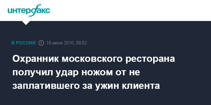 Москва. 18 июня. INTERFAX.RU - На юге столицы охранник одного из ресторанов получил в четверг ножевое ранение от клиента, отказавшегося заплатить за ужин, сообщил "Интерфаксу" источник в правоохранительных органах города. "В дежурную часть поступило сообщение о том, что из ресторана, расположенного на Варшавском шоссе, с проникающим ножевым ранением груди в больницу был доставлен 24-летний мужчина - охранник ресторана", - рассказал собеседник агентства. Он отметил, что, по словам потерпевшего, удар ножом он получил в помещении от неизвестного во время конфликта из-за отказа оплатить счет.
